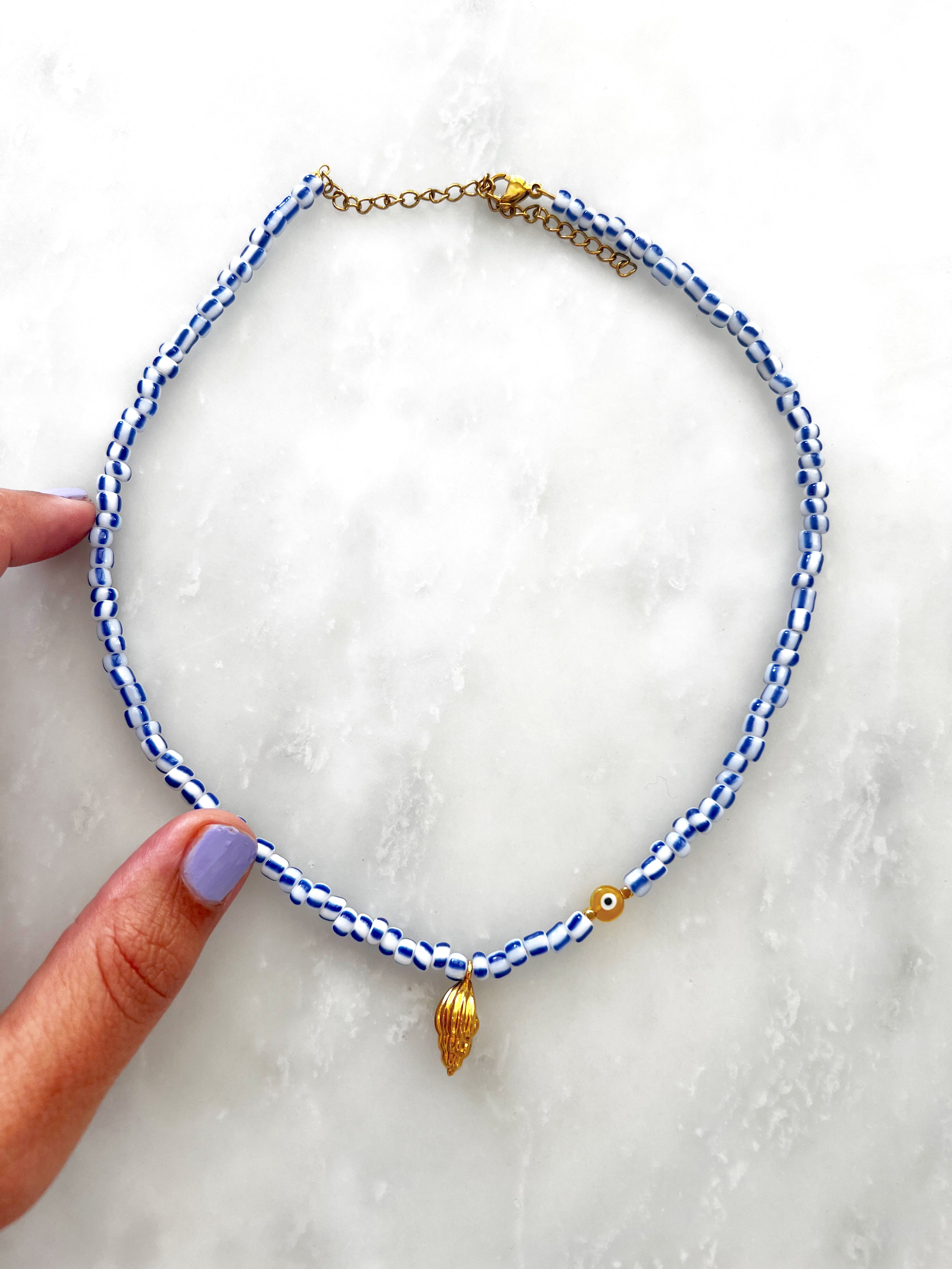 A super cute summer necklace featuring white and blue striped beads, a dainty gold shell charm, and a tiny eye bead for a touch of fun and protection. Perfect for playful beach layering!