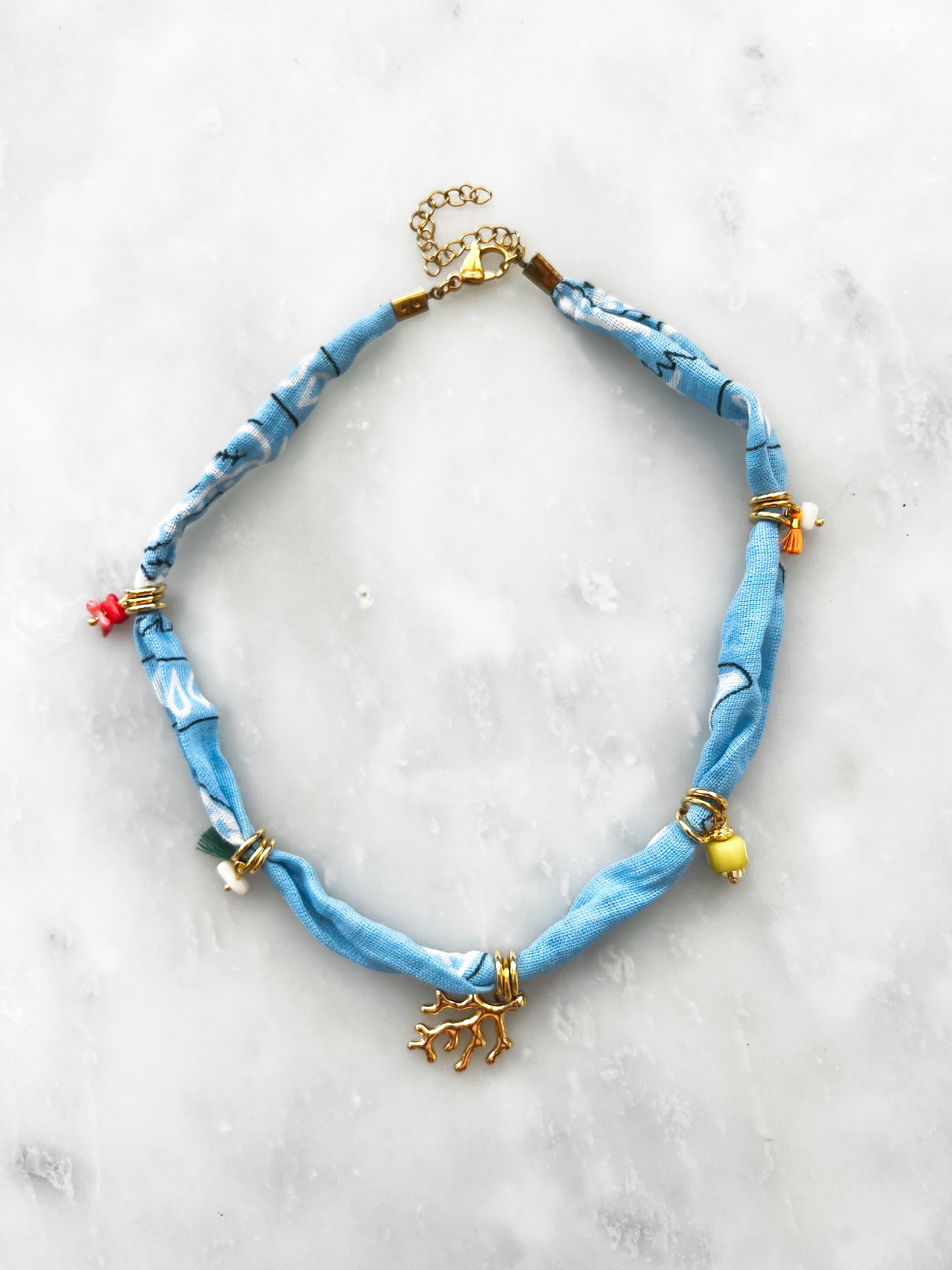Elevate your style with these unique layering ocean pieces! A handmade light blue bandana necklace with a stunning gold coral.