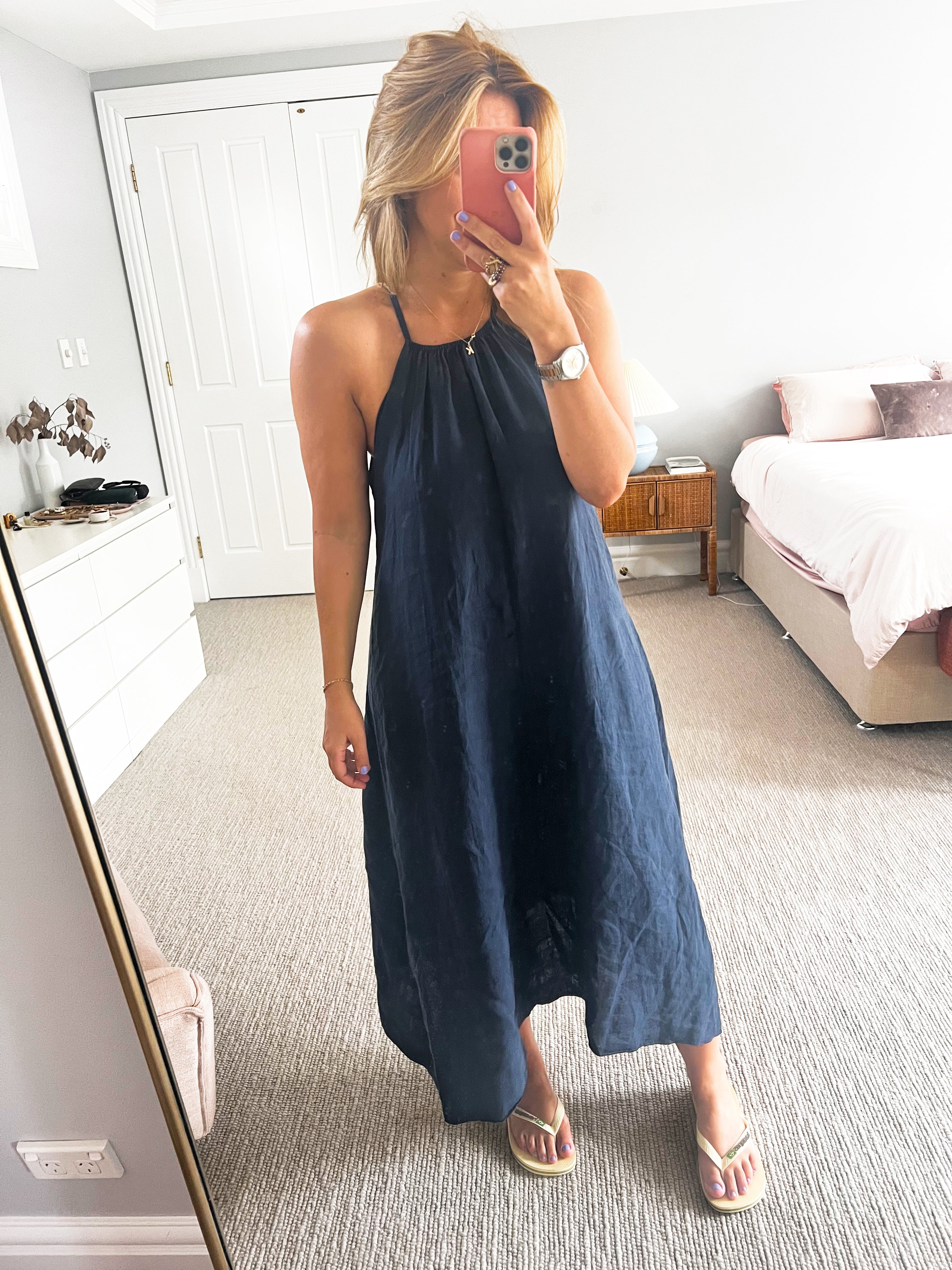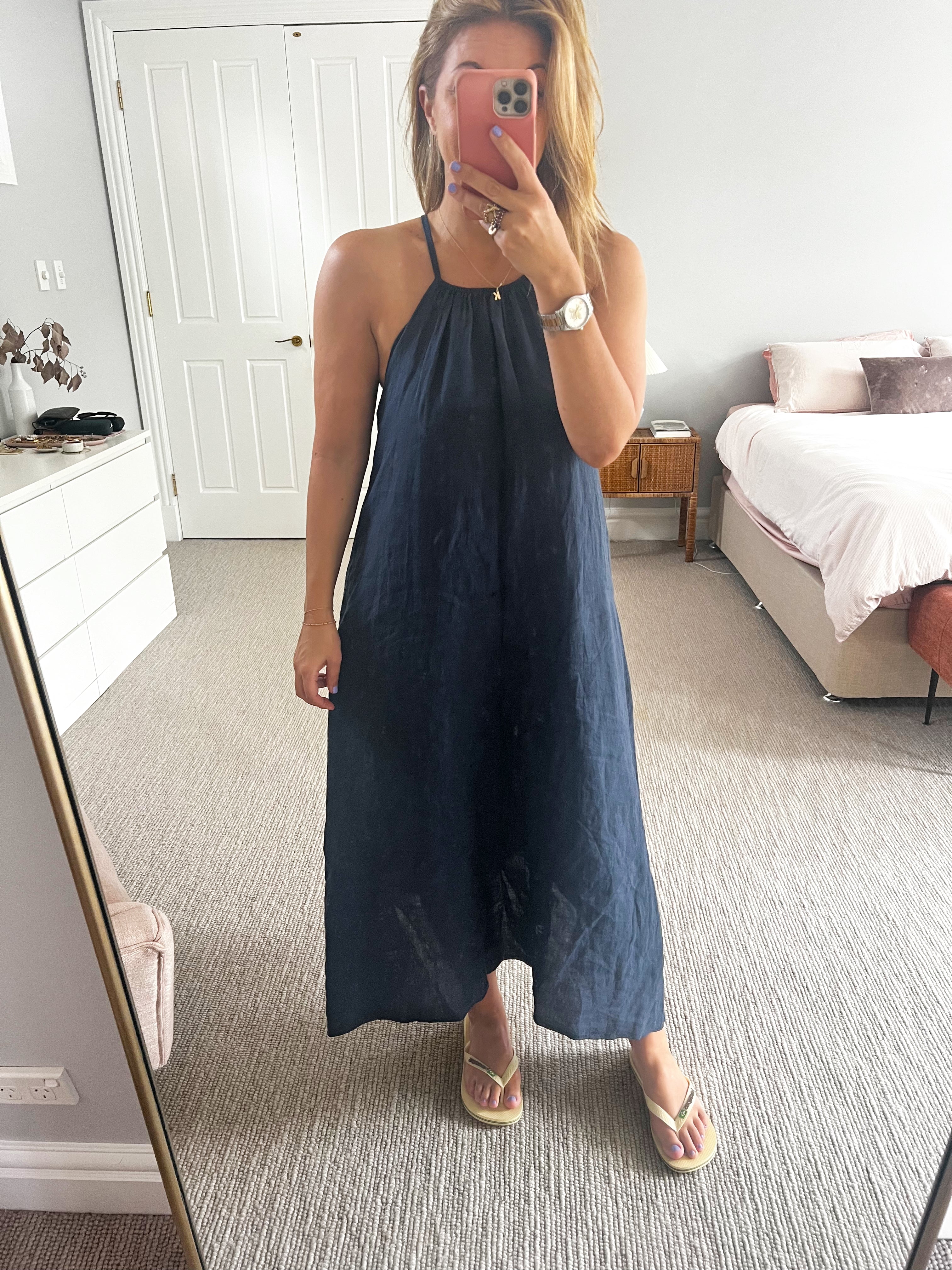We have a new ( in house ) racer-back dress to fall in love with. Crafted from soft lightweight Italian linen, with a hankerchief hem.